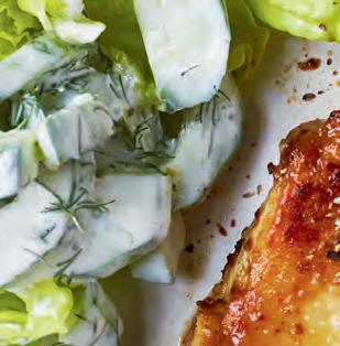 Rør syrnet øde, dild, citronskal og citronsaft sammen og vend agurkerne i cremen. Smag til med friskkværnet peber og måske en smule agesalt. Vend koteletterne i hvedemel krydret med salt og peber. Brun koteletterne 1 min. på hver side ved god varme og steg dem færdige ca. 3 min. på hver side ved middel varme.