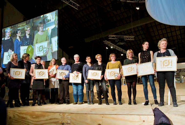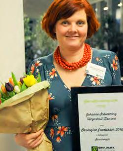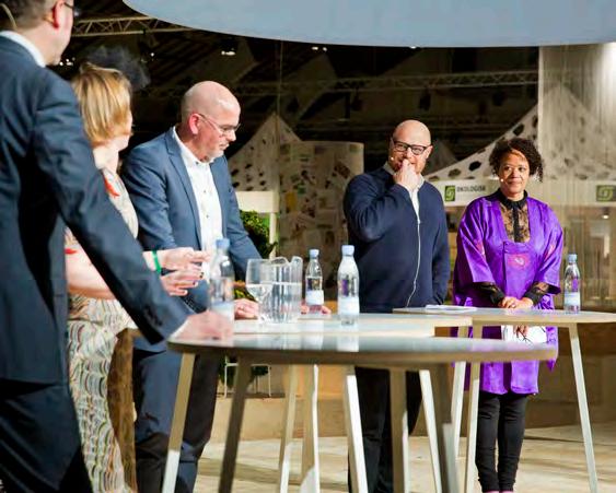 økologisk spisemærke i guld. Og det blev magisk, da folk spontant rejste sig op og klappede over den lange rejse ind i økologi-procenterne, de havde taget. Årets økopris blev givet til Byens Køkken i Odense, der hver dag laver 2500 kommunale måltider – og fik prisen for at have taget beslutningen om at omlægge til økologi. En stolt rådmand fra Fyns hovedstad gav salen stolte smil og begejstrede ord tilbage. Og fik store klapsalver igen. Pludselig gik bandet Liga på en anden scene og gav tre numre. Spontan dans i mellemrummene mellem stolerækkerne. Weekendstemning på en mandag aften. Dansene kroppe. Nye fælles sprog. Nye møder.
