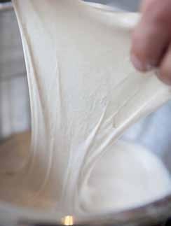 - Det spændende er, om konsistensen bevarer den skvulpende struktur. En hvededej som denne skal være som tyggegummi. Det er den struktur, jeg er på jagt efter. Se engang!