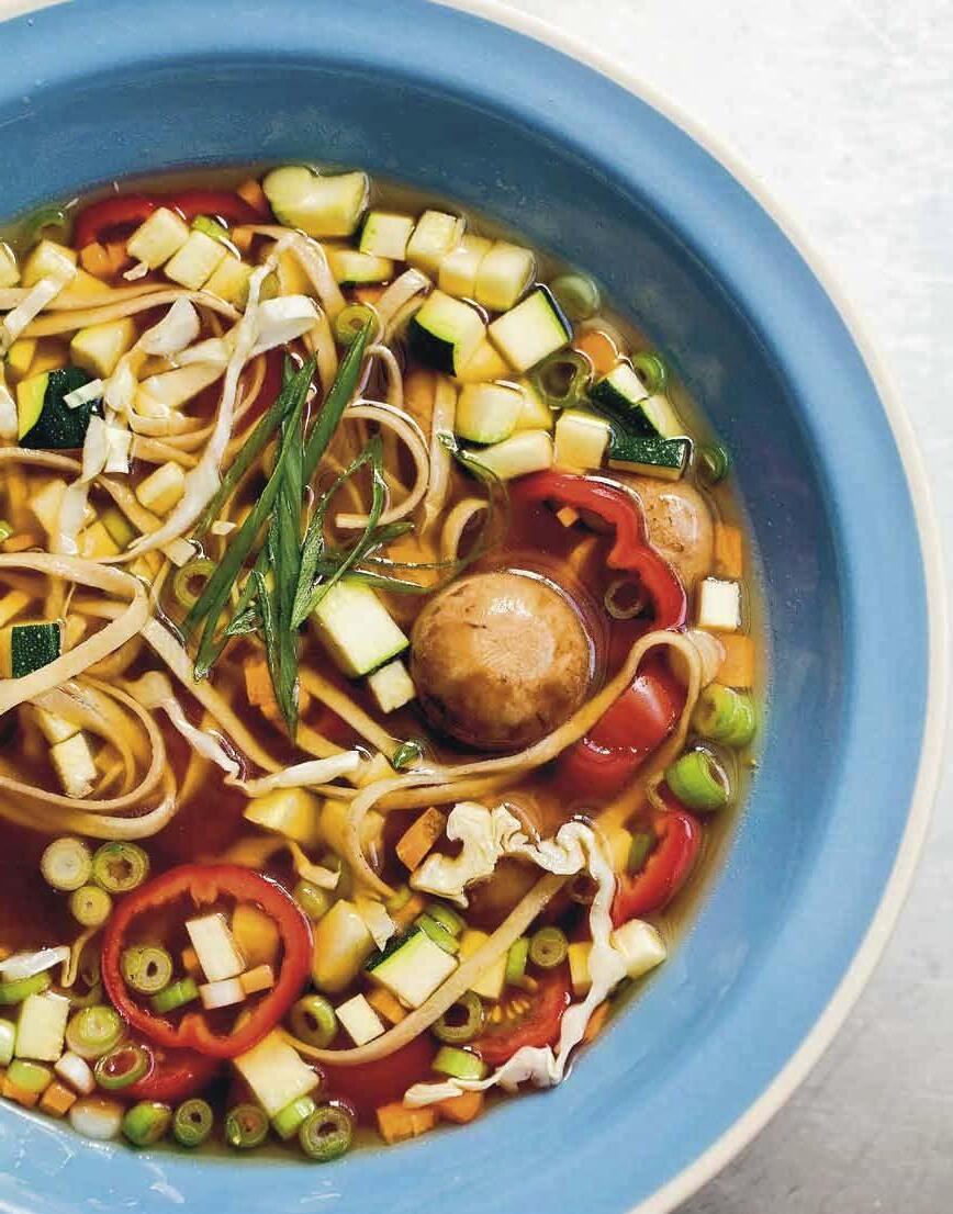 Sådan gør du: Hvidløg pilles, squash og løg skæres i tern. De hele hvidløgsfed svitses i olien sammen med de øvrige grøntsager. Tomater og bouillon tilsættes efter ca. 5 min. sammen med krydderurterne. Det hele simrer i 25-30 min. Grønsagerne skal være helt møre. Blend suppen (stavblender er perfekt), og smag til med salt og peber. Serveres med et godt stykke brød til. Du får en mere mættende suppe ved at blende en kop kogte hvide bønner eller kogte kikærter med suppen. Smager mindst lige så godt dagen efter.