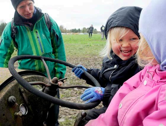 gende, men vi finder en gammel Ferguson, der rustende står i læsiden af en stor bygning. Et perfekt frokost-spot, hvor Alma og Filippa leger landmænd på traktoren, mens de får frokostmadderne stukket i hånden. Vi gumler, mens køerne fordeler sig ude på den bølgende mark. Nogle græsser allerede. Gumlende. Inde fra bygningen bag os lyder glade, lyse børnestemmer. Det skyldes en halmhoppeborg. Efter frokosten suges Alma og Filippas opmærksomhed ind i borgen. De rutsjer fra en balle ned i den bløde halm. Og hopper. Og lader sig falde og får halm i håret. Og kådt kaster de halm på de voksne. Og de voksne kaster ret store totter tilbage.