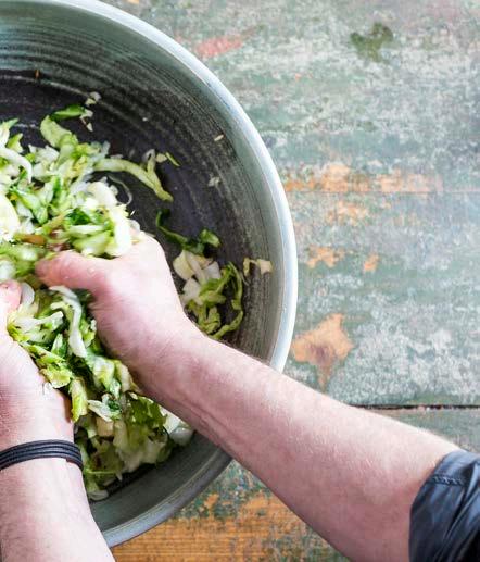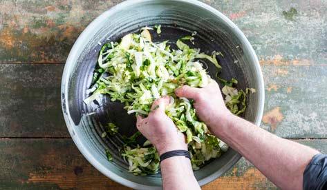 Søren Ejlersen knytter sine næver om en håndfuld kålblanding. Kålsaften pibler ud mellem fingrene på ham og drypper ned