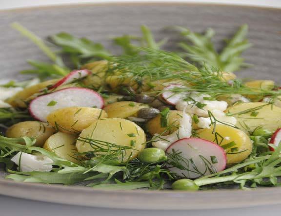 Kartoflen er en velkendt, elsket og enormt anvendelig lille knold. Den giver fylde og konsistens til en ret samt en god mæthedsfornemmelse. Først på sommeren er de som vejret: lette, spæde og sødlige – og vi længes efter dem ligesom forårssolen. De er lækre i salater eller kogt netop møre i selskab af en smørstegt rødspætte. Senere på sommeren har jubelstemningen lagt sig, og de er gode tyndt skåret på en pizza, i grøntsagspakker på grillen eller som tilbehør til en større bøf og tungere sovs. I caféen har vi altid en kartoffelsalat i disken året rundt – og så skifter de øvrige ingredienser i kartoffelsalaten med sæsonen.