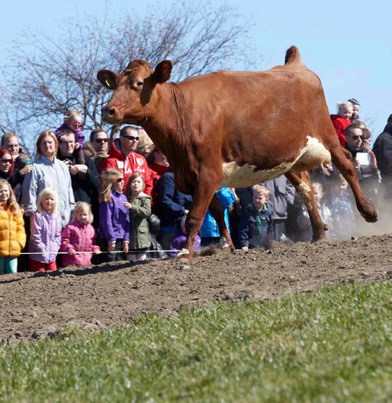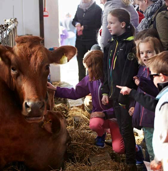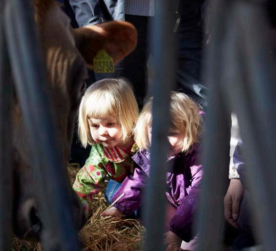 OP TIL 40 LITER MÆLK OM DAGEN En stor mand med rygmærke dukker op. ”Vært”, står der. Langt de fleste gæster er taget hjem, så økologen har god tid til at fortælle mere om gårdens jerseykøer. De kan i gennemsnit levere 26 liter mælk om dagen. Og de bedste køer kan levere op omkring 40 liter. Vi runder lige gårdspladsen igen, før vi som nogen af de allersidste forlader Karensminde. Her uddeles smagsprøver ved to boder. Alma og Filippa får både en håndfuld ostehaps og et drikkegrus hver, hvor det indre af glasset er formet som et yver. Det er sjovt at drikke mælk af, synes de. Og skåler.