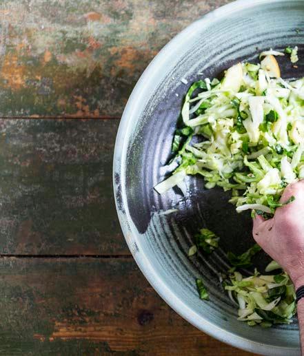 Et godt værktøj for en fermentist er en stor, åben keramikskål, hvor du nemt kan knuge og arbejde ihærdigt med den saftende kål uden at svine ud over dit køkkenbord.