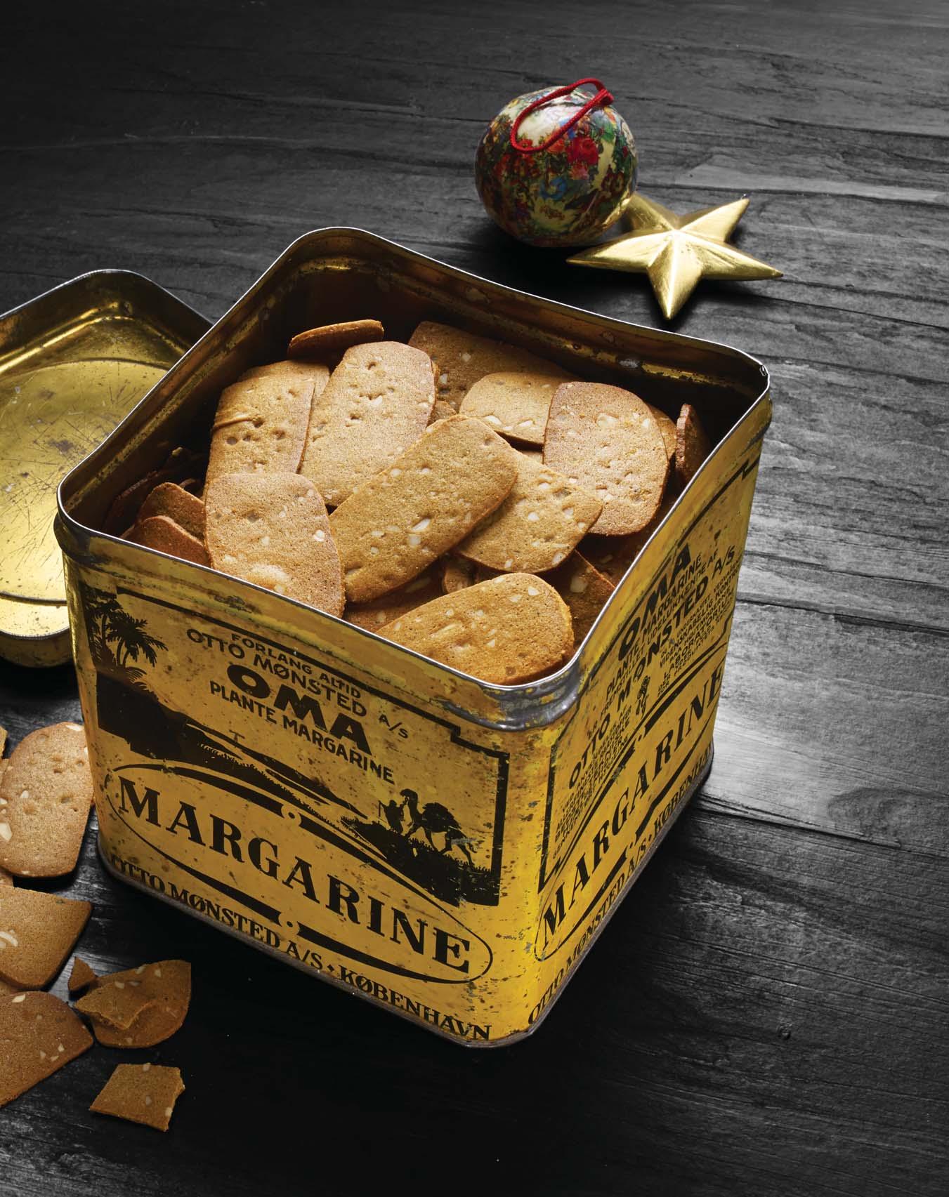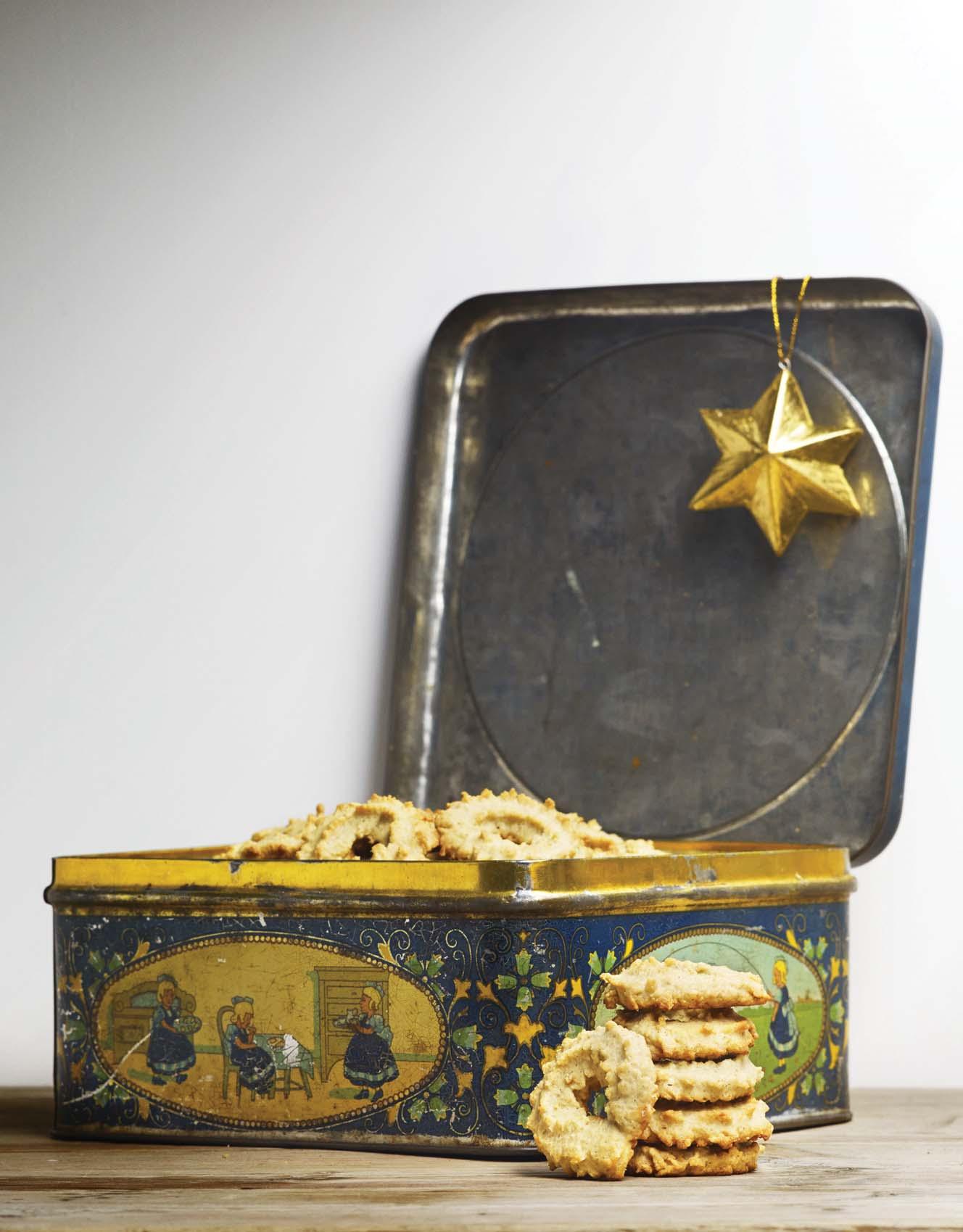 Kør derpå dejen til ’pølser’ gennem en kødhakker (monteret med stjerneform), skær af ’pølserne’ og form til små kranse, som bages på en smurt bageplade i 7-8 minutter i en 200 grader varm ovn. Kom forsigtigt kager over på en bagerist, g lad dem afkøle helt, før de kommes på dåse eller glas med tætsluttende låg.
