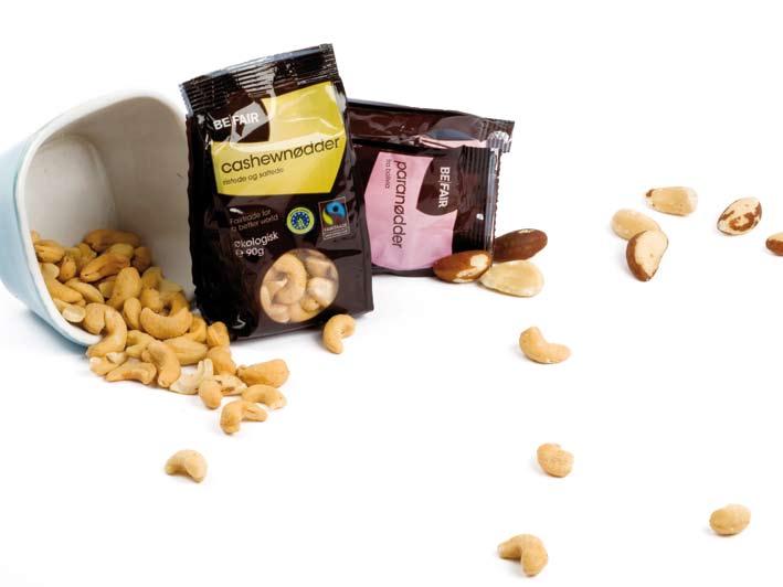 beFair sælger via Coop og helsebutikker to nye poser med nødder. i Coop koster en pose med 100 gram paranødder 21,95 kr., mens prisen på 90 gram ristede cashewnødder er 22,95 kr. beFair sælger i øvrigt kun produkter, der både er Fair trade og økologiske.