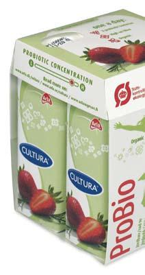 arla-brandet Cultura har sendt Danmarks første økologiske shot ud i supermarkederne. Probio smager af jordbær/rød te og er en koncentreret drik, som indeholder fibre og bakterier, der skulle hjælpe med at holde din mave sund. emballagen er også miljøvenlig.