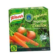 knorr har udviklet en øko-serie af mixretter, supper og bouilloner. Her ser du økologisk bouillon med oksekød, kylling og grøntsager til 17,95 kr. Sælges i de fleste supermarkeder.
