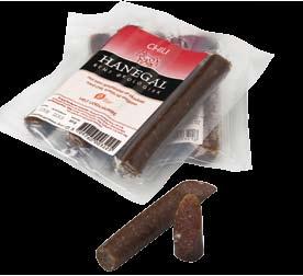 Hanegal har lanceret en serie med spegepølse-haps. De skal ikke ligge på køl og fås i varianterne Chili, Mild og Pepperoni. Forhandles i Coop til 14,95 kr. pr. pakke med 60 gram.