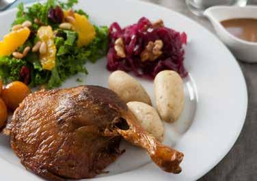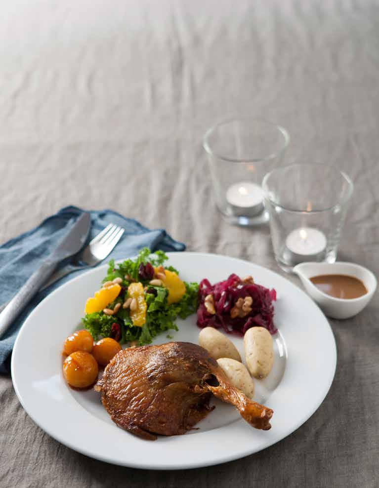 Hjernøes juletallerken. Her får du opskriften på et juleaftensmåltid, som Anne Hjernøe selv har hentet hovedingrediensen til hos ande-økologen fra Brunholm. Ud over de traditionelle ingredienser som and, kartofler og rødkål får du også hendes grønkålssalat med appelsin og tranebær.