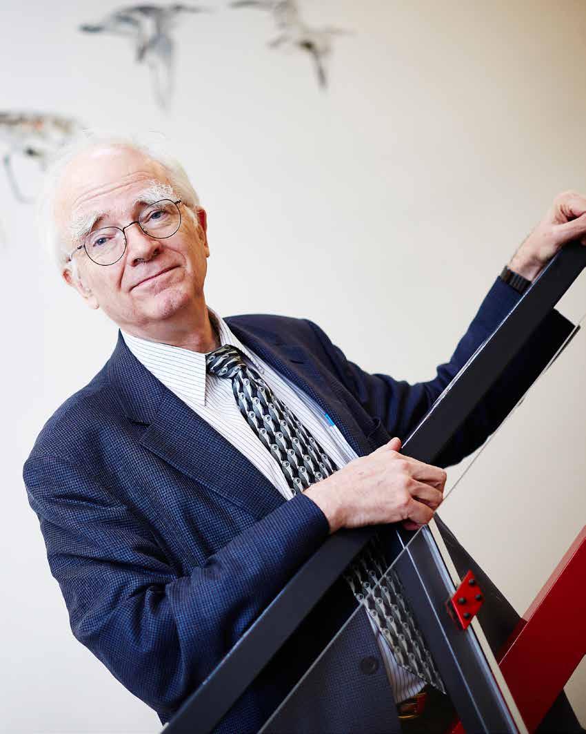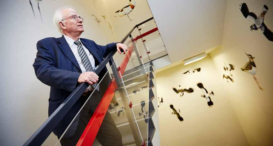 Kobbersnepper, gravænder og viber pryder trapperummet op til den miljømedicinske afdeling på Syddansk Universitet. Philippe Grandjean nyder synet hver eneste gang, han vandrer op mod sit kontor.