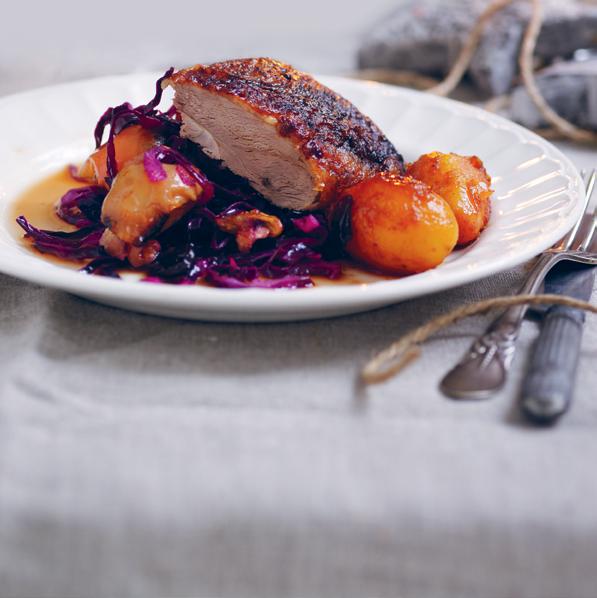 Skær stegen ud i tynde skiver og server med sauce, rødkål og brunede katofler.