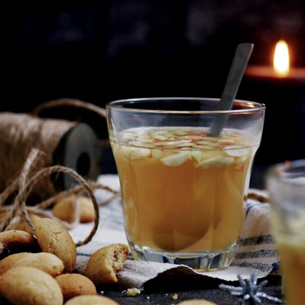 æblegløgg med ingefær. Sprød og sund grønkålssalat. Saftig medisterpølse.
