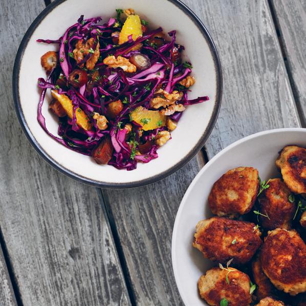 Hak valnøddekernerne groft. Skyl persillen, slyng den helt fri for vand og hak den fint. Vend appelsinfileter, dadler, valnødder og persille rødkålen. Smag salaten til med friskkværnet peber.