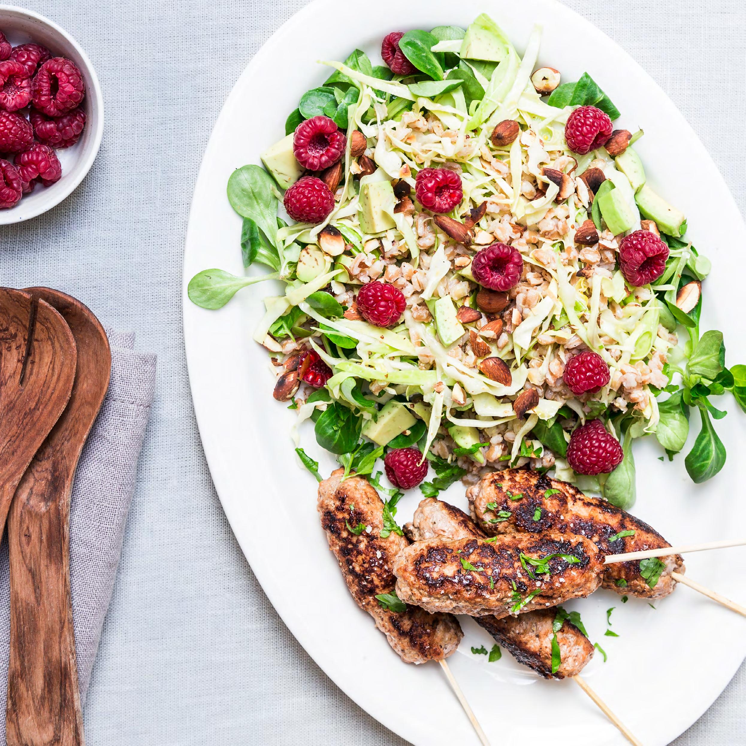 SIDE 17 Krydrede svinespyd & speltsalat med friske hindbær
