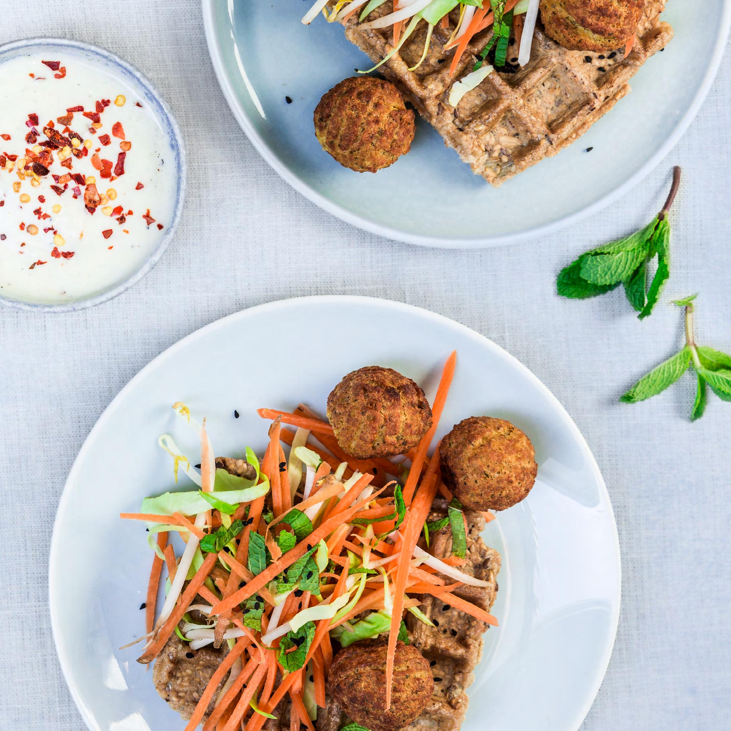 Sprøde madvafler med kålsalat, falafler & yoghurtdressing