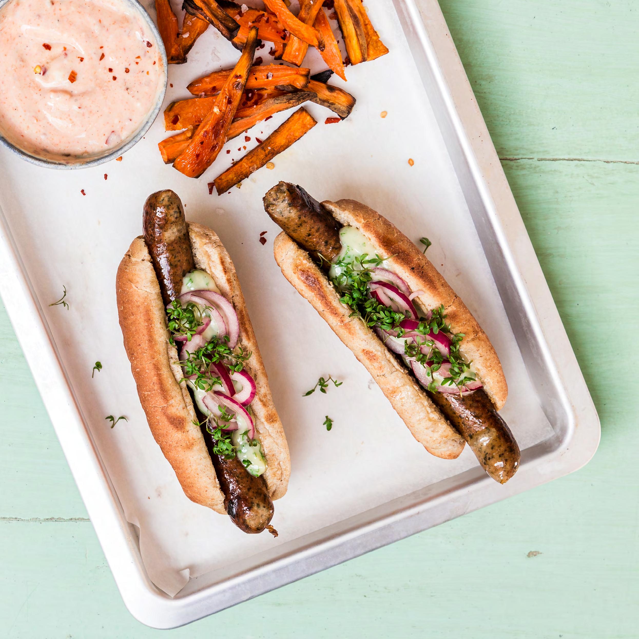 Hotdogs med syltede løg, ramsløgsmayo & søde fritter