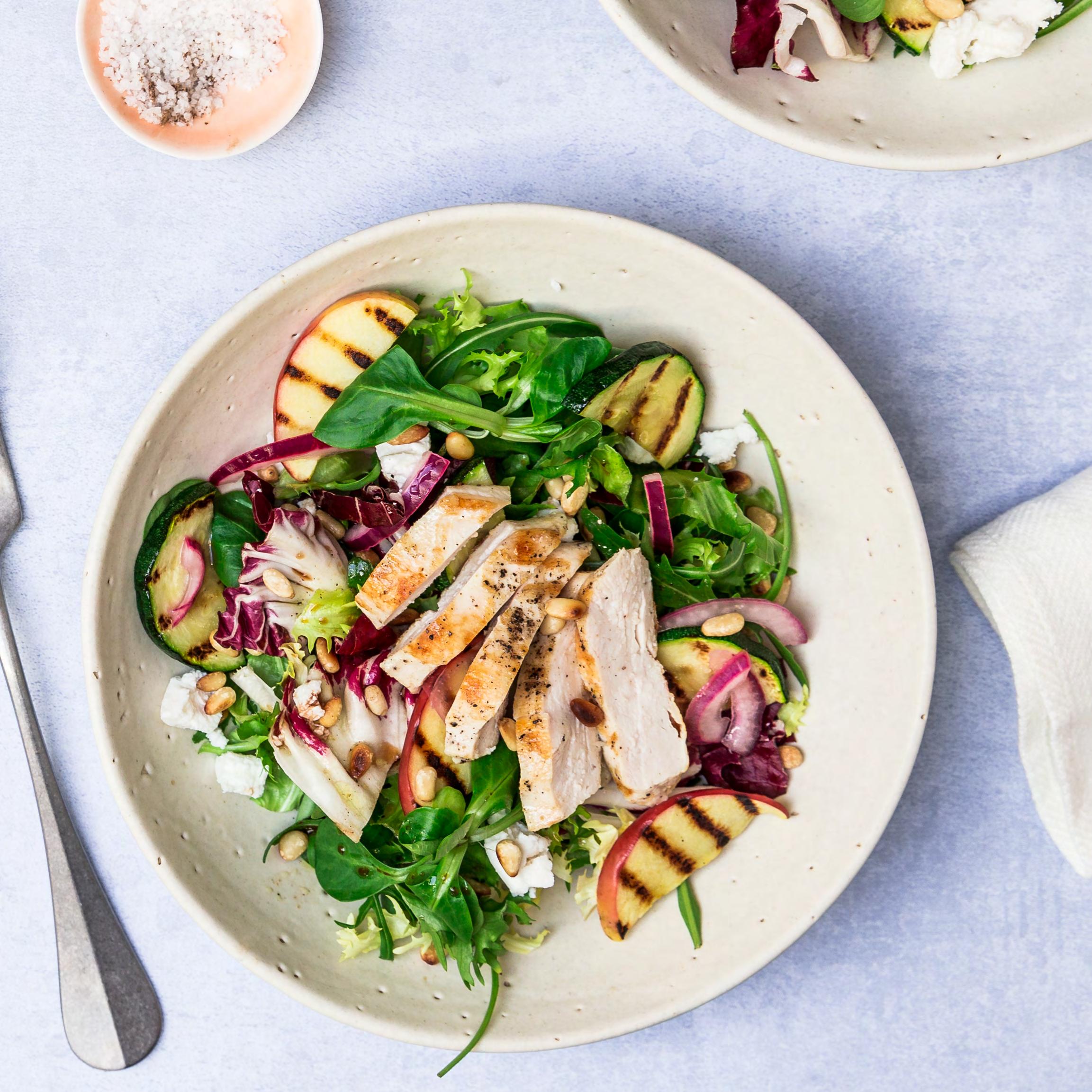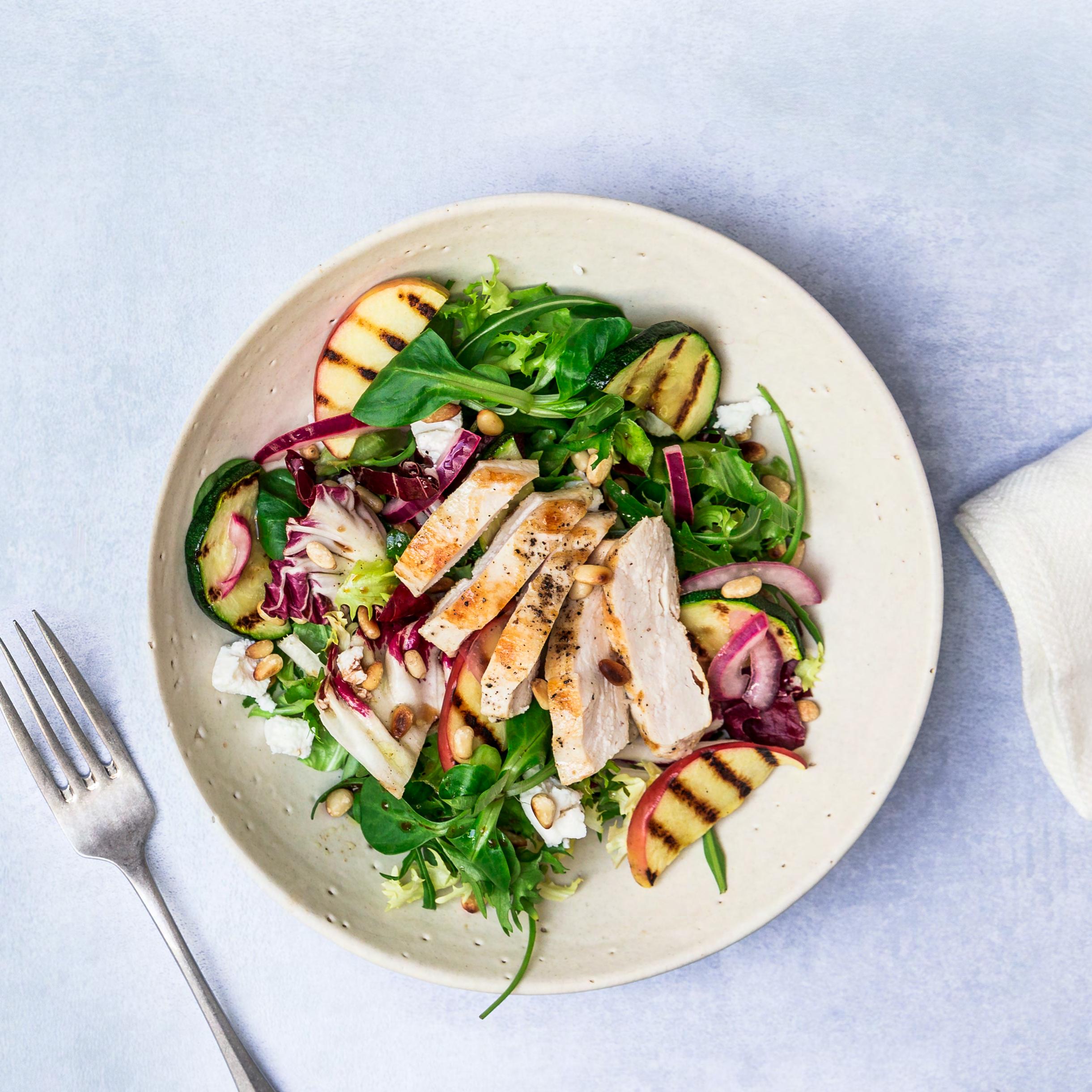 Mættende salat med æble, grillet kylling & ristede pinjekerner