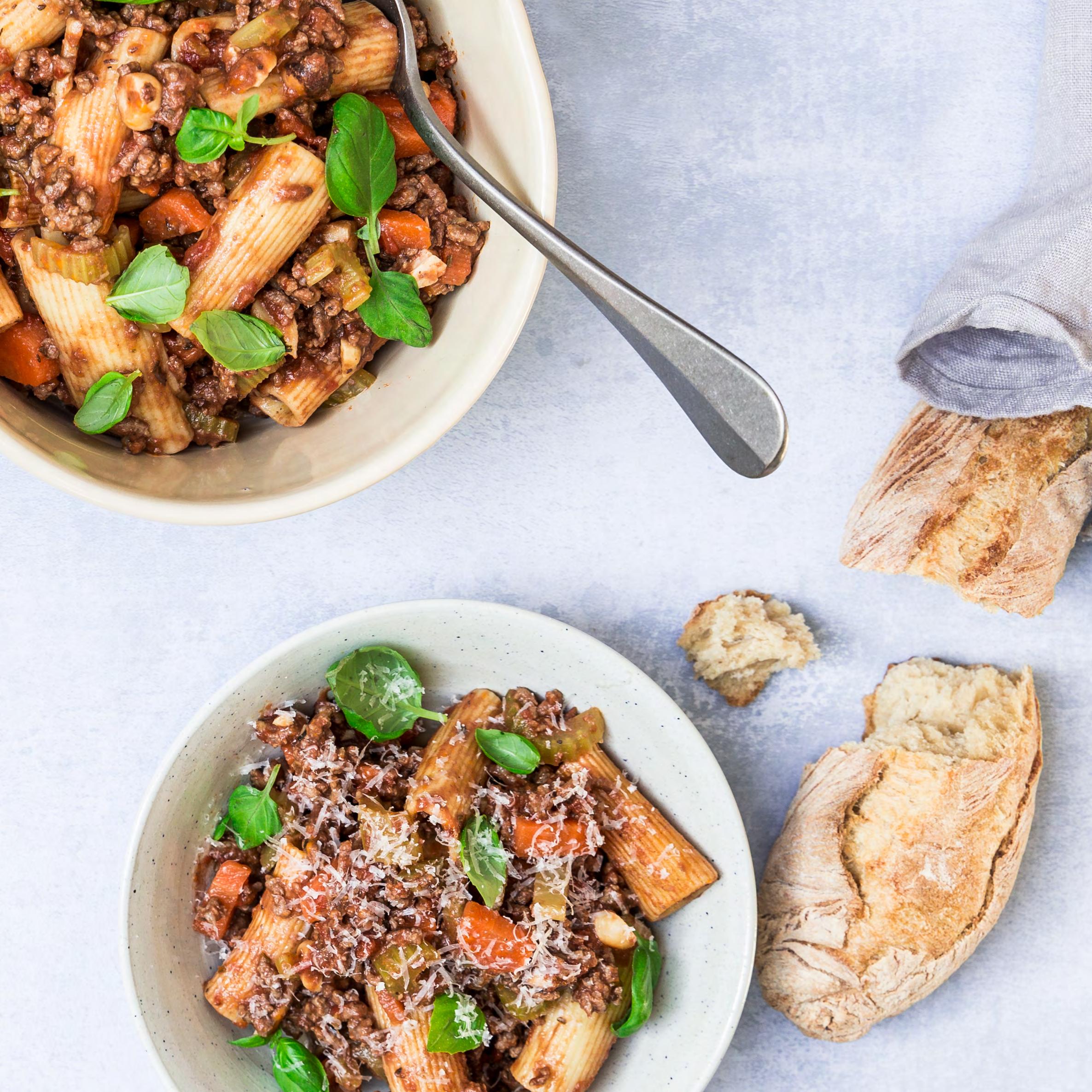 Varm olien op i en stor pande eller gryde, der kan komme låg på. Kom løg, hvidløg, selleri og gulerod i og svits i 2-3 minutter. Tilsæt oregano, rosmarin og hakket kød, og svits yderligere i 3-4 minutter, indtil kødet har fået farve. Hæld tomater, vand og balsamico i panden, og lad retten simre i ca. 15 minutter.