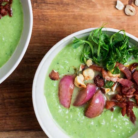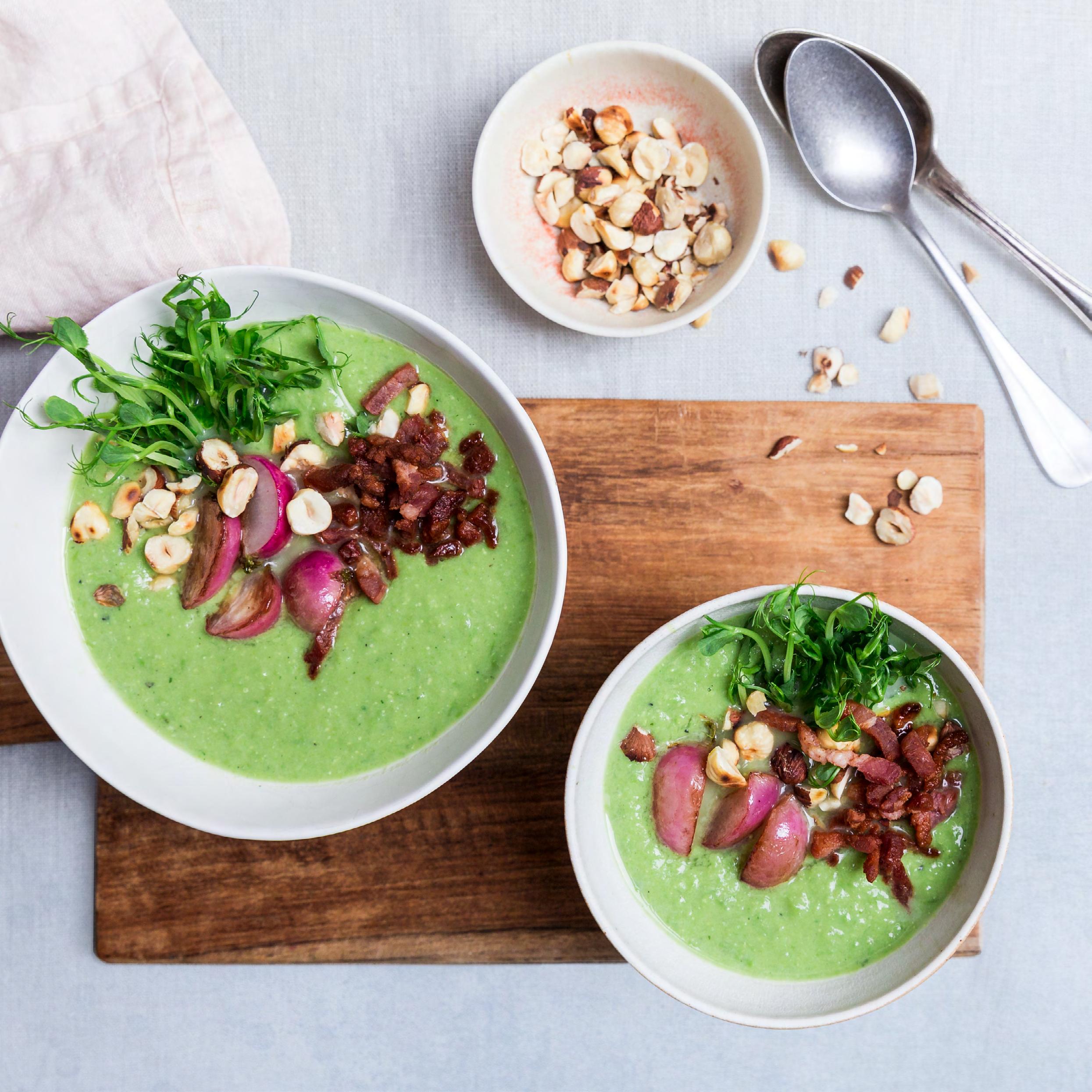 Rist hasselnødderne på en pande, og hak dem groft. Servér suppen med ristede hasselnødder, radiser, ærteskud og sprødstegt bacon på toppen.