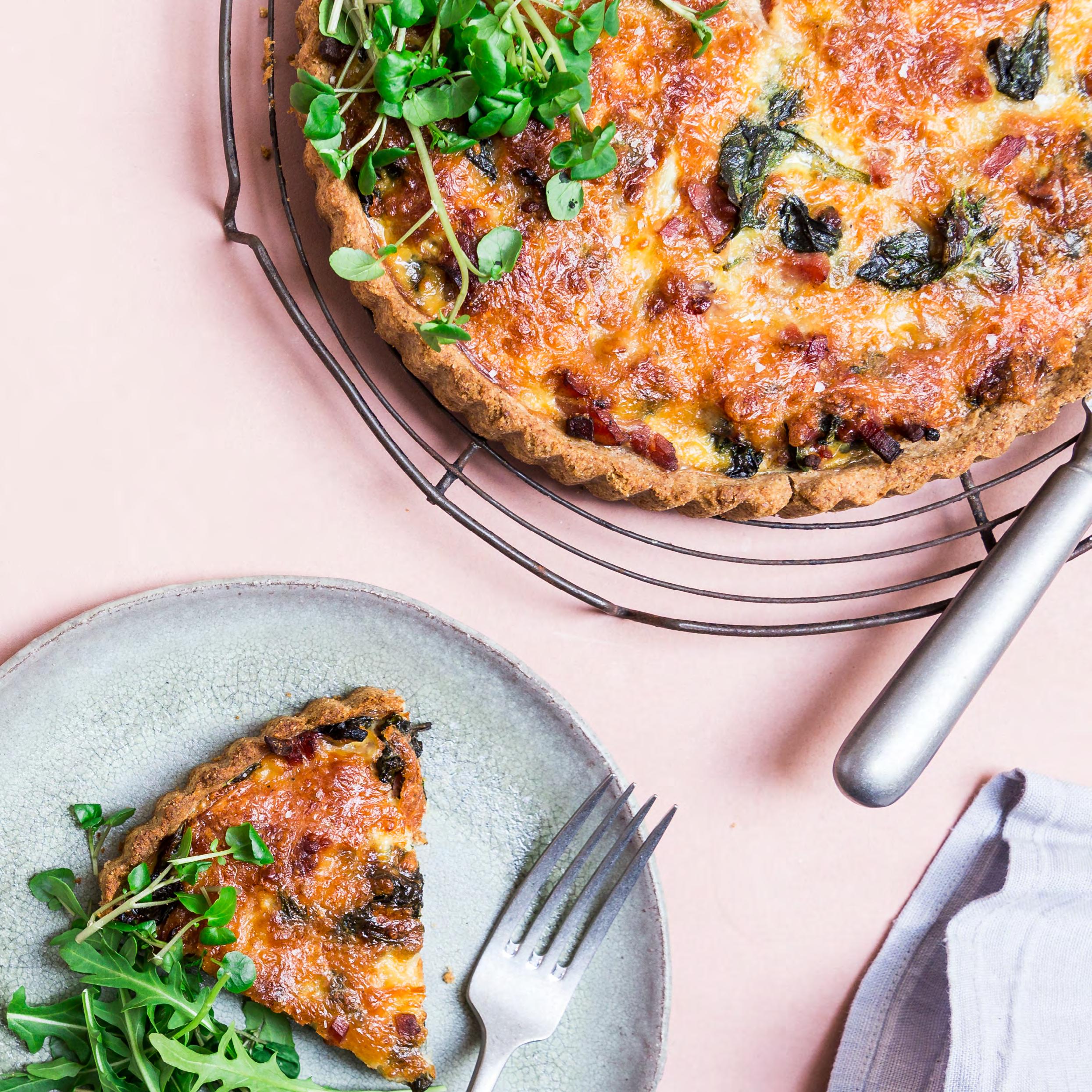 Grov bacontærte med spinat