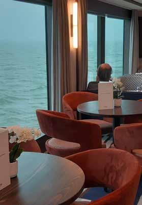 Bij een cruise is het leven op het schip een belangrijk onderdeel van de reis. Bij goed weer speelt dat zich voor een groot deel af op het dek. Maar dat is ons alleen de laatste namiddag en avond gegund. De andere dagen is het koud en nat. We laten ons daardoor niet tegenhouden om de steden te verkennen waar we aanleggen, met een goede regenjas en paraplu valt het allemaal best mee, maar eens terug aan boord houden we het toch liever droog en warm. We blijven dus binnen. Door de grote ramen van de panorama lounge zie je de oevers evengoed en de gratis drankjes in de bar (alcoholische en niet-alchoholische alternatieven) maken het best gezellig. Ons voornemen om niet al te gretig al dat lekkers op ons bord te (laten) schuiven, houdt geen stand. Dit is niet het moment voor dat soort voornemens.