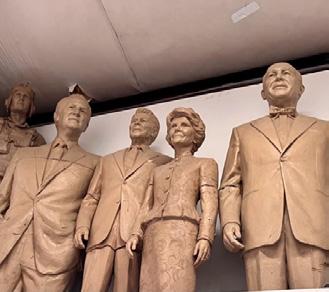 Clockwise L to R: Walker’s vision to build the best fine art bronze casting foundry on the East Coast came to fruition in 1990. Carolina Bronze Sculpture is a fine-art bronze foundry located in the Central North Carolina town of Seagrove and has grown to become one of the preeminent sculpture manufacturers on the East Coast. • Work on the initial sculptural concept of the German Shephard for one of the four Mount Holly, North Carolina sculptures. • The Phoenix commissioned by Elon University in Elon, NC. features a phoenix rising from a concrete column that resembles a twist of flames. The base weighs more than 3,400 pounds. The sculpture stands roughly 12-feet tall, with the phoenix boasting a 10-foot wing span.• Walker adding final details. • Another of the fallen officer commissions. Standing Officer and Girl Police Memorial, Mount Holly, NC.• Murrell Warren “Teedy” Thornhill, Jr., was one of the most beloved and influential Lynchburg, VA citizens of the 20th century. The first African American mayor of the Hill City and the first council member elected from Lynchburg’s historically Black Ward II. The life-sized bronze statue was unveiled and dedicated on August 19, 2023, in Lynchburg. • Sculptor of President Ronald Reagan and the First Lady in process. • Walker’s 6’ tall version of the Concord Minuteman, based on the original version of the Minuteman located in Concord, Massachusetts by Daniel Chester French, is located at the National Guard Headquarters Visitor Center in Richmond, VA. It represents a minuteman, symbolically leaving his coat and plow behind to aid his compatriots in the first battle with the British at the start of the revolutionary war. Each casting in the edition of 100 is signed by the artist and comes with a certificate of authenticity. The one in VA is #1/100.