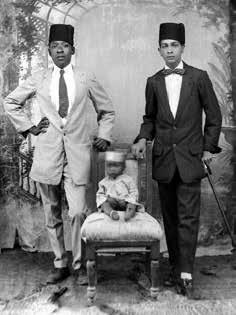 5: Two dapper men with canes and neckties along with the traditional Swahili kofia or prayer cap, have their portrait taken alongside a young woman displaying her jewellery.