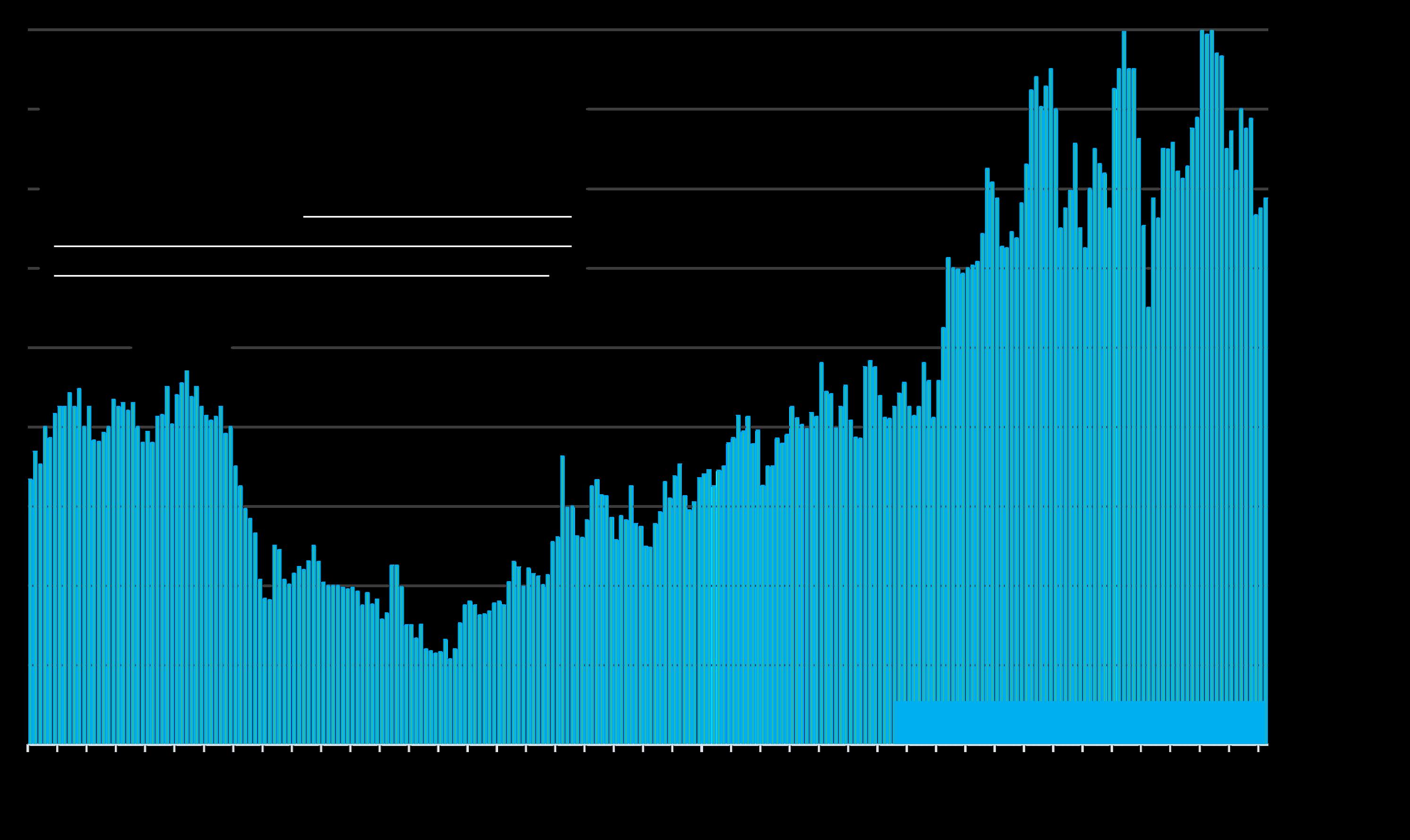 Median $/sq.ft. value is a very general statistic, disguising an enormous range of values in the underlying sales. It is often affected by other factors besides changes in fair market value. Monthly and seasonal fluctuations are common, which explain many of the regular ups and downs in this chart. Longer-term trends are much more meaningful than short-term changes.