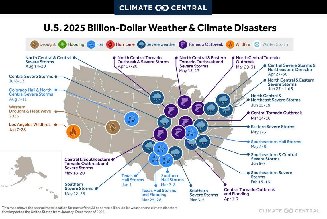 Per https://www.climatecentral.org/climate-services/billion-dollar-disasters. Data from sources deemed reliable but may contain errors and subject to revision.