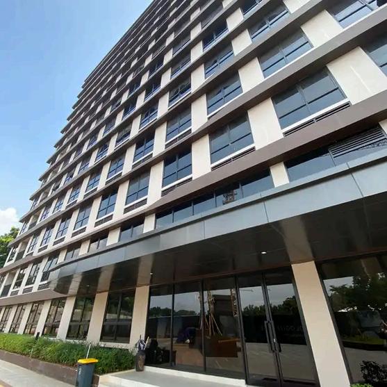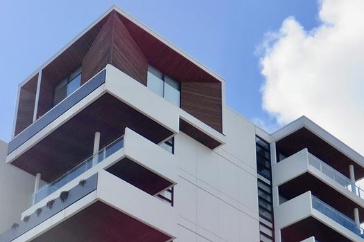 Material fasad pada bangunan ini adalah panel logam sebagai bukaan kisi-kisi kayu pada balkon beton precast dan lapisan kayu.