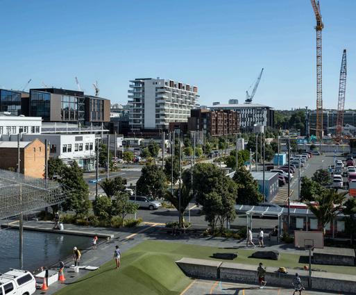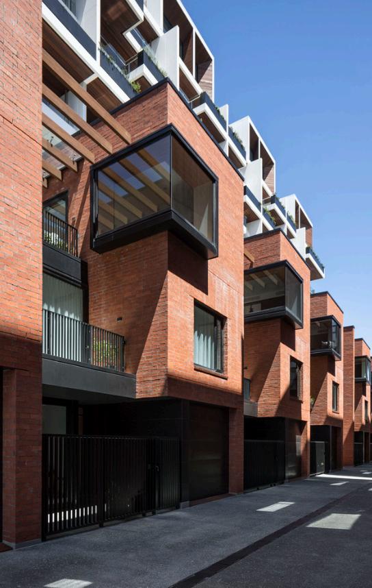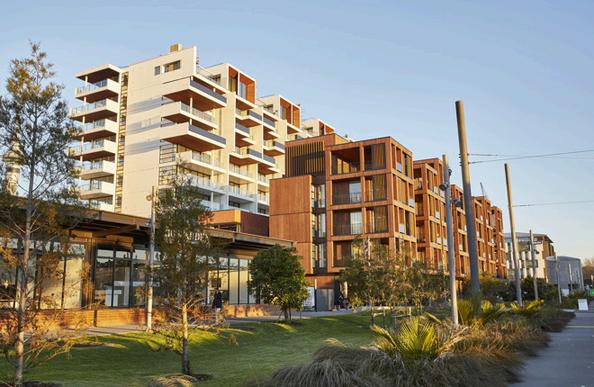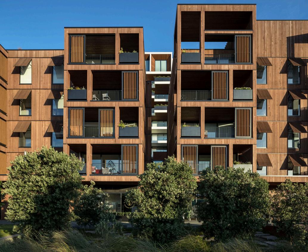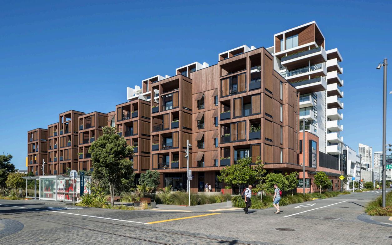 Quarter Auckland, Selandia Baru. Proyek ini mencakup berbagai tipologi hunian seperti paviliun berlapis kayu rumah mews berlapis bata dan apartemen artisan dari beton dan baja.