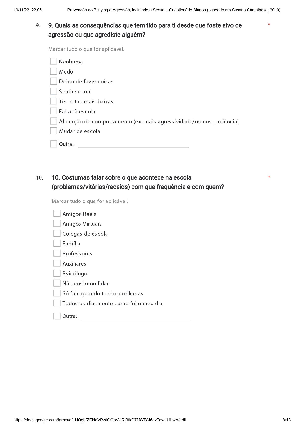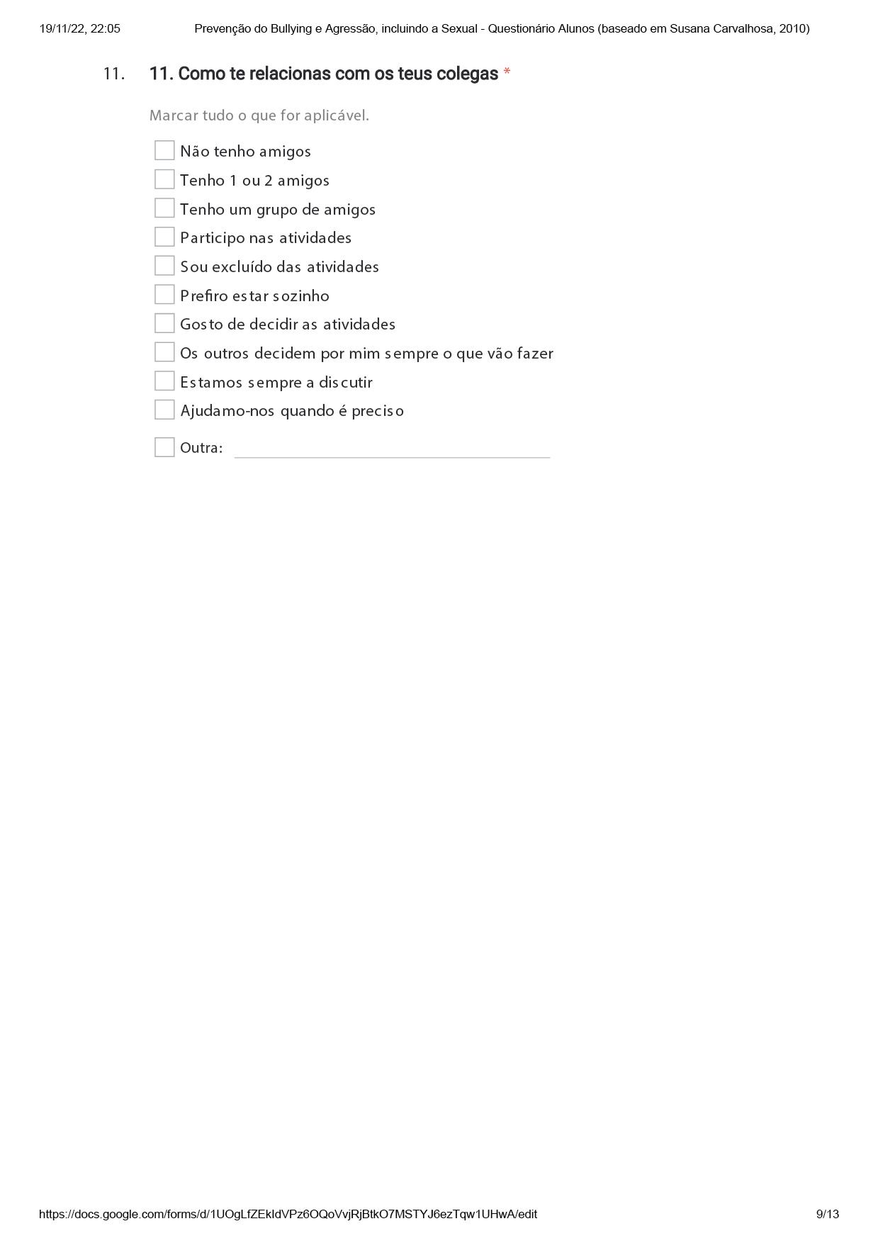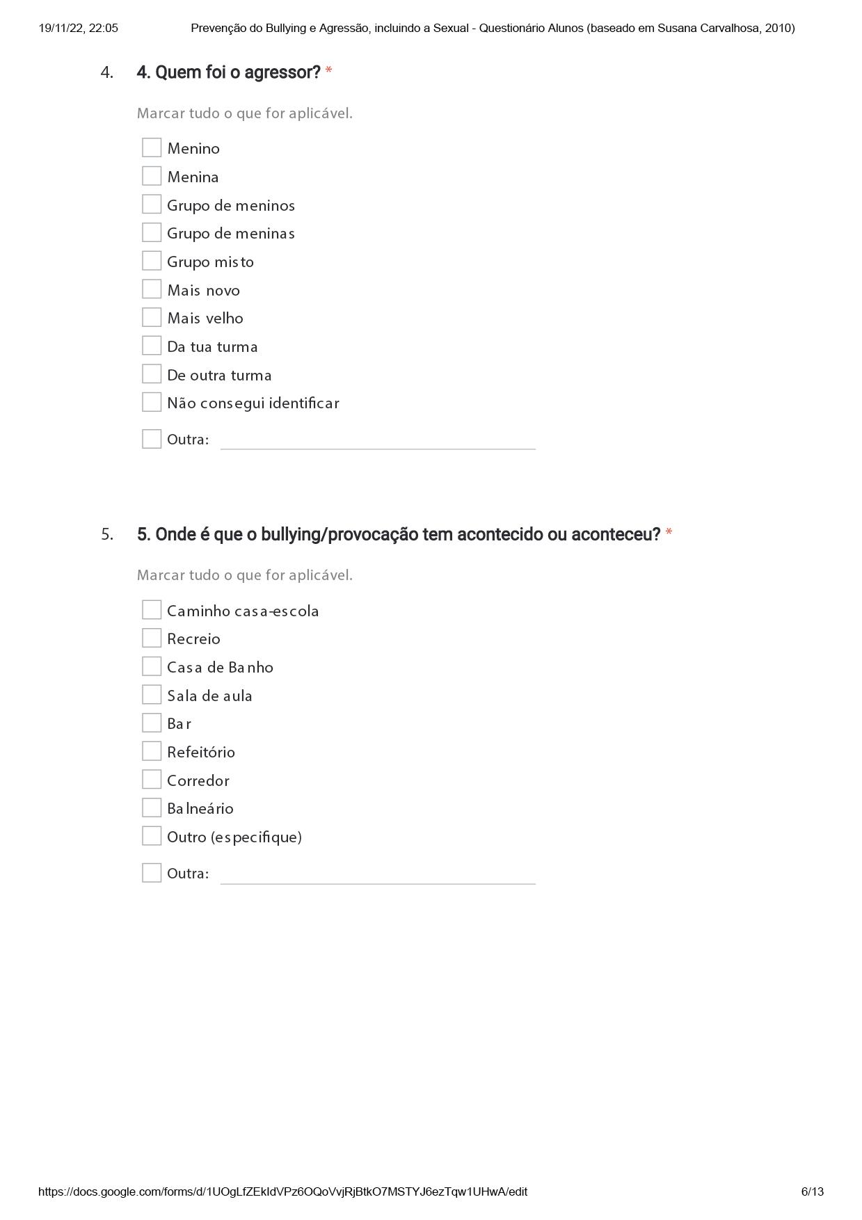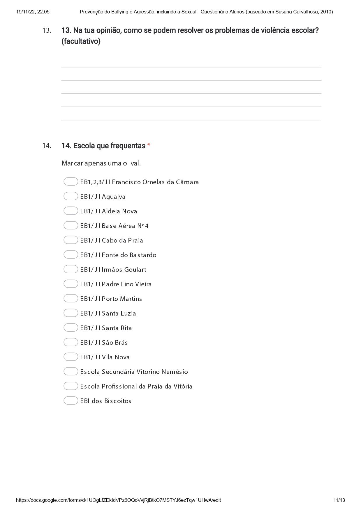 6. Recolha de informação sobre a ocorrência de situações de bullying no município da Praia da Vitória, em contexto escolar, passando pela aplicação de um inquérito nas escolas do município da Praia da Vitória, presencialmente no estabelecimento de ensino ou via online, preenchido por pessoas que são/foram vítimas de bullying, que são/foram testemunhas de bullying ou que tomaram conhecimento do mesmos, para mapeamento e caracterização do fenómeno, bem como para o reforço da prevenção e do combate ao bullying;