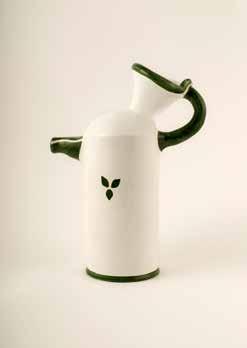 Bottiglia smaltata, bianca, con decori verde oliva. Il suo carattere sta nel collegamento del cono di raccolta dell’olio con il manico.