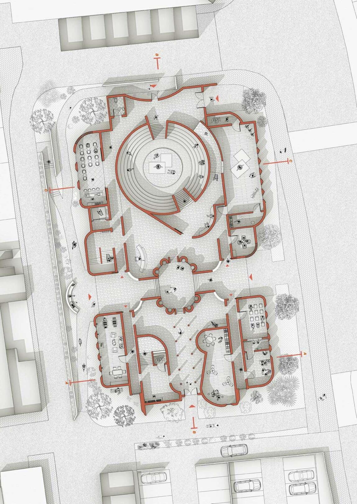 - Section BB cuts through the care centres and the recreationaltheatre.