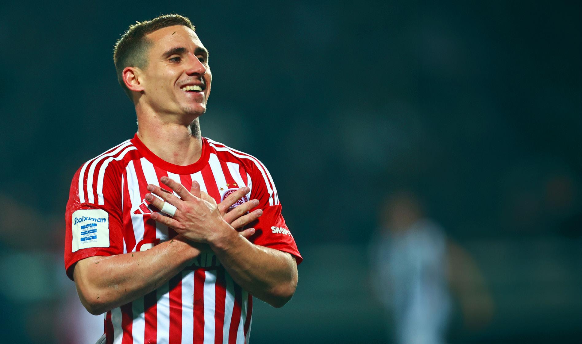Ο πανηγυρισμός του Γιώργου Μασούρα λίγο μετά το γκολ που πέτυχε απέναντι στον ΠΑΟΚ, οδηγώντας τον Ολυμπιακό σε νίκη με