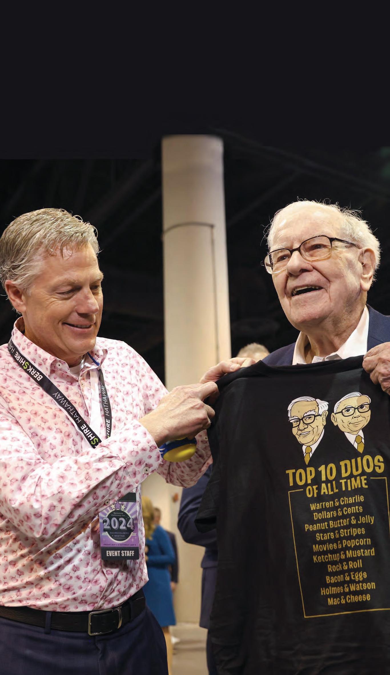 Warren Buffett is presented a T-shirt during Berkshire Hathaway’s Shareholder Shopping Day at the CHI Health Center, complimenting him and his long-time business partner, Charlie Munger. NIKOS FRAZIER