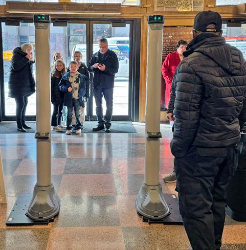 I will walk through security scanners when I enter, sometimes these make beeping noises. A security guard may wave a wand over my body, if not, I will keep walking to get my ticket scanned.