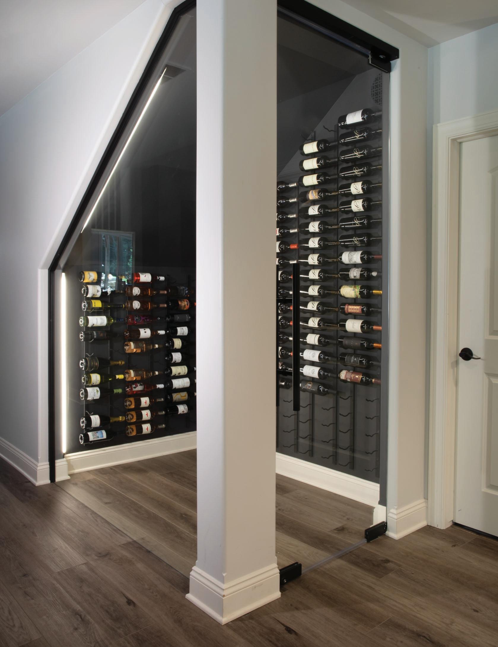 The wine room is neatly tucked under the stairs, making great use of a space that is typically forgotten. With our space limitations in the bar, we wanted to use every inch of room for stor age and display. We added a custom glass wall and door to make this bar area a showcase while keeping the room closed off from the children in the family.
