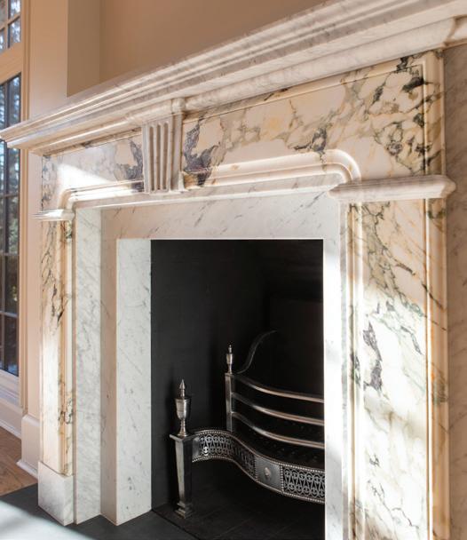 Down a long hall, the formal dining room sits on one side, with the library on the other. A solid Italian gray Breche marble fire surround from Jamb serves as the focal point, elevating the space. Several 18thcentury fire surrounds appear throughout the home, from the great room to the dining room and library.
