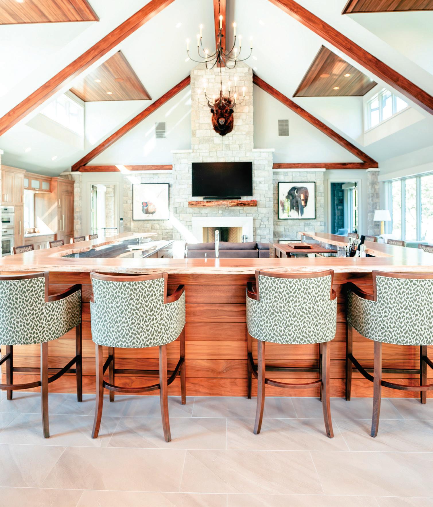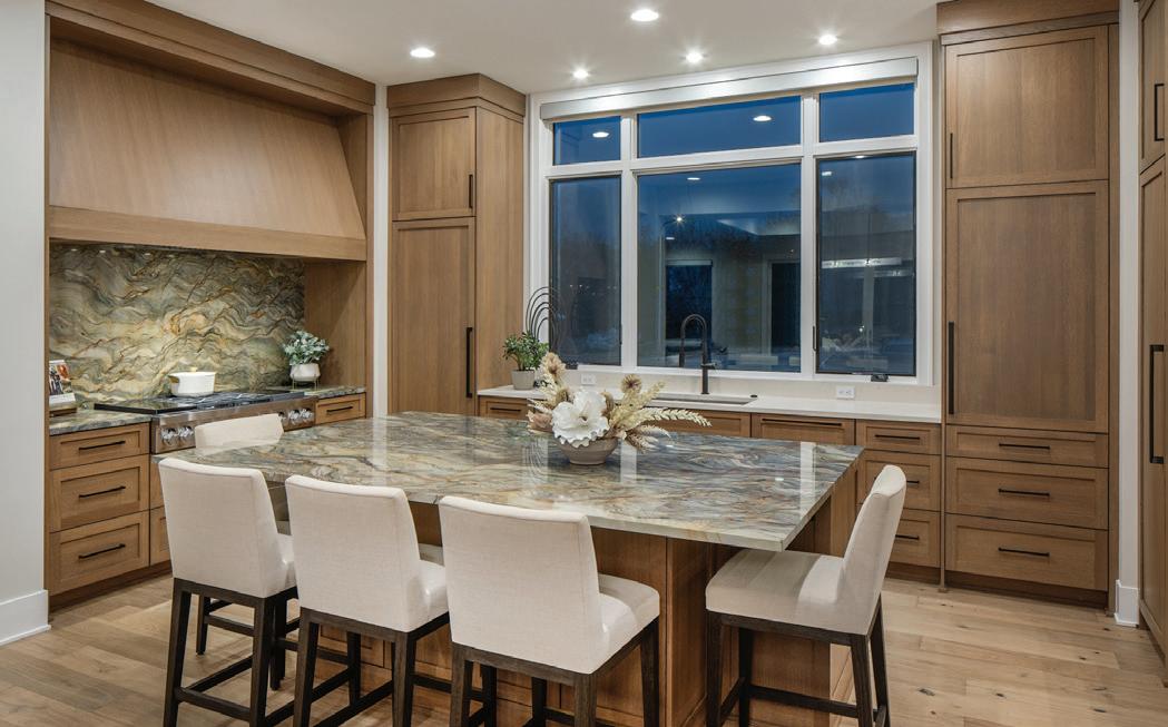 The heart of the home revolves around the open-concept great room and kitchen, where a striking stone-wood clad fireplace surround serves as the focal point. Horizontal wood accents and bands were purposefully designed to seamlessly integrate the natural stone, wood veneers, and layers of lighting into the feature wall. The exposed wood beams span the ceiling, adding structural warmth and empha-