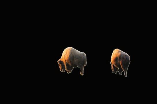 Unfortunately, poachers and traffic take their toll. From 2009 to 2023, 49 grizzlies in the Greater Yellowstone Ecosystem died when hit by vehicles. And so it was in the dark of one night in October 2024 that a car traveling on a highway about 50 miles south of Jackson hit and killed Grizzly 399 while she fed on a carcass with a cub. “She had been going there about four, fi ve years,” Mangelsen said. “Also, archers would kill deer and elk and leave gut piles along the roads. They had been feeding on a carcass for a day.”