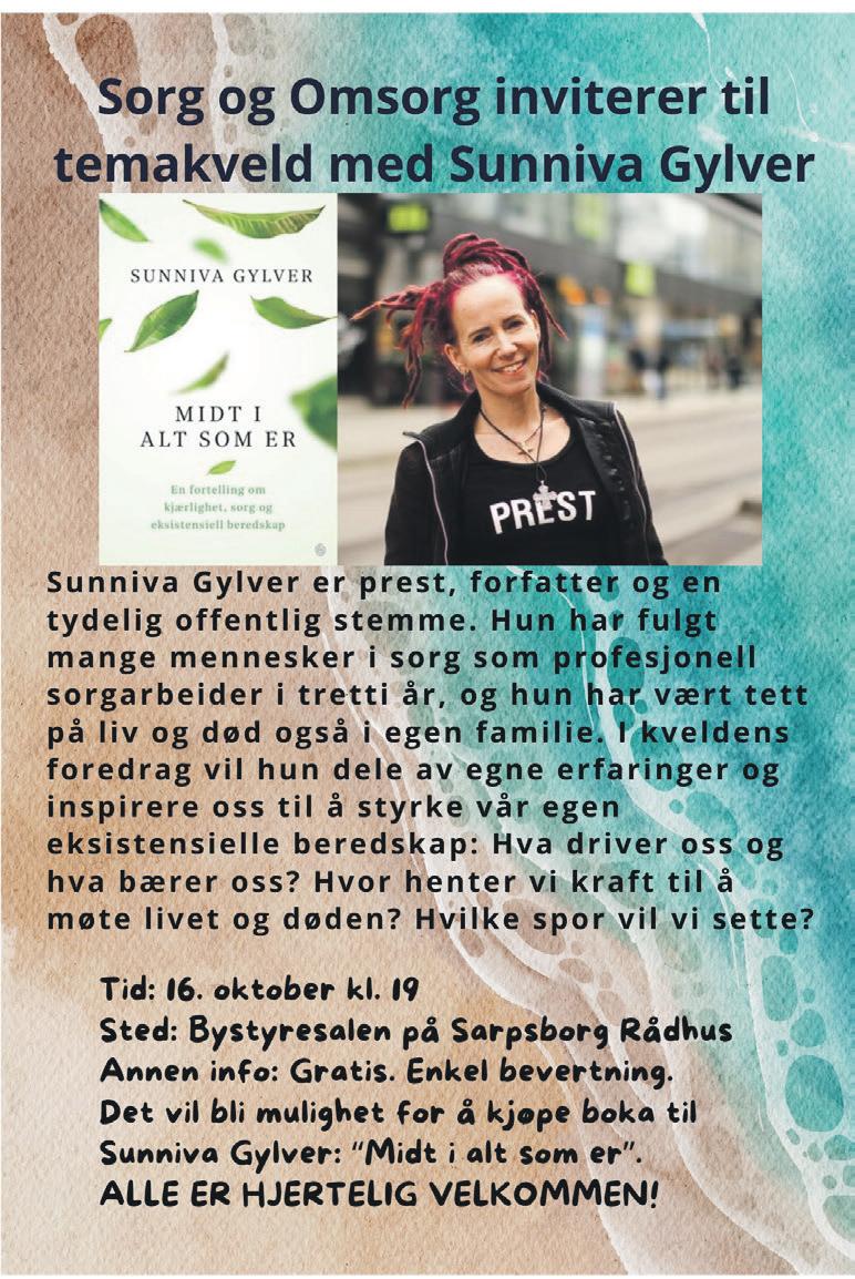 16. oktober inviterer Sorg og Omsorg i Sarpsborg til temamøte i bystyresalen i rådhuset, med Sunniva Gylver som foredragsholder.