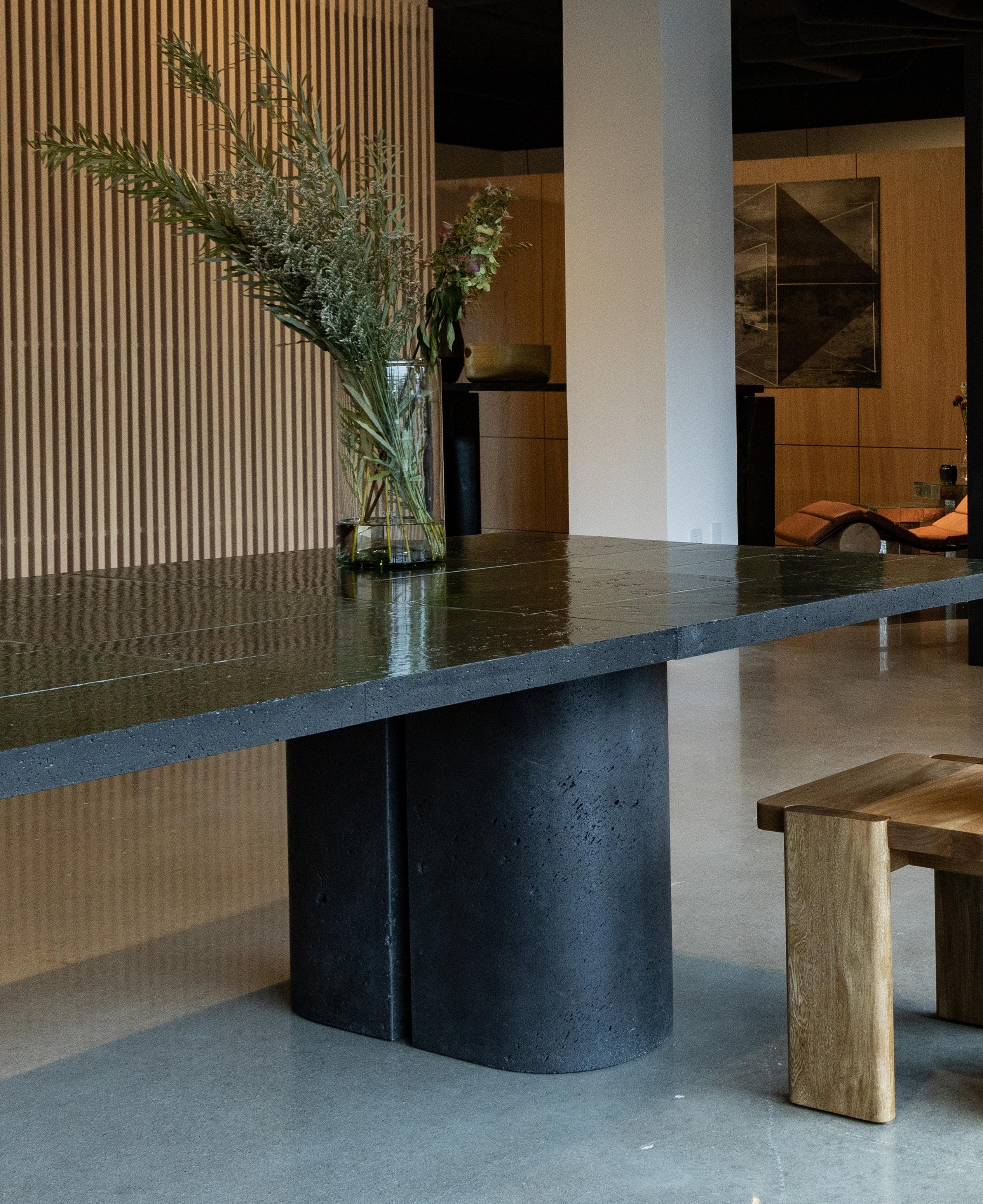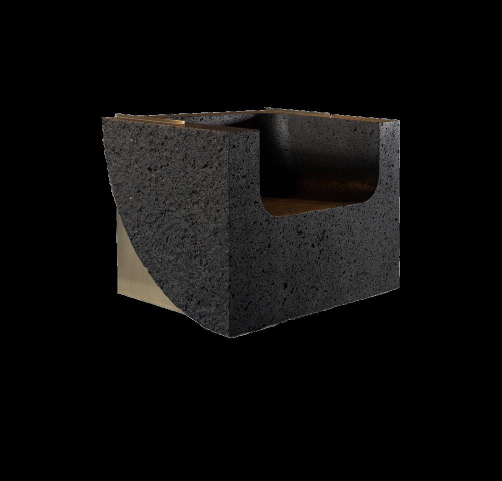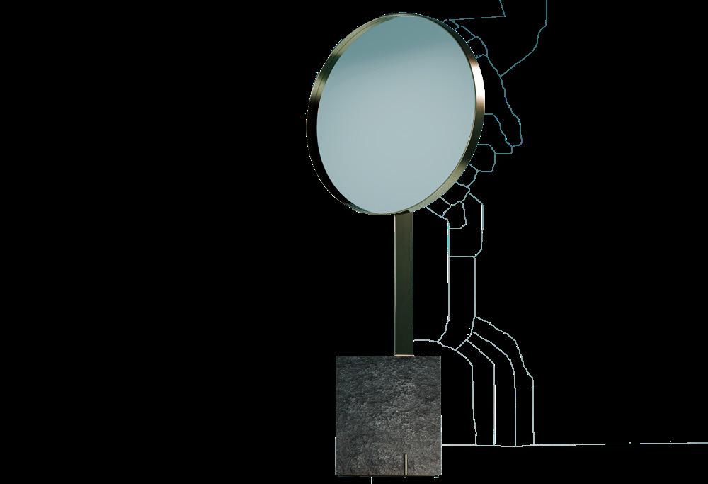 VOLCANIC STONE BASE WITH AN ADJUSTABLE MIRROR, EXEMPLIFYING FORM AND FUNCTION TO ADAPT TO ANY SPACE.