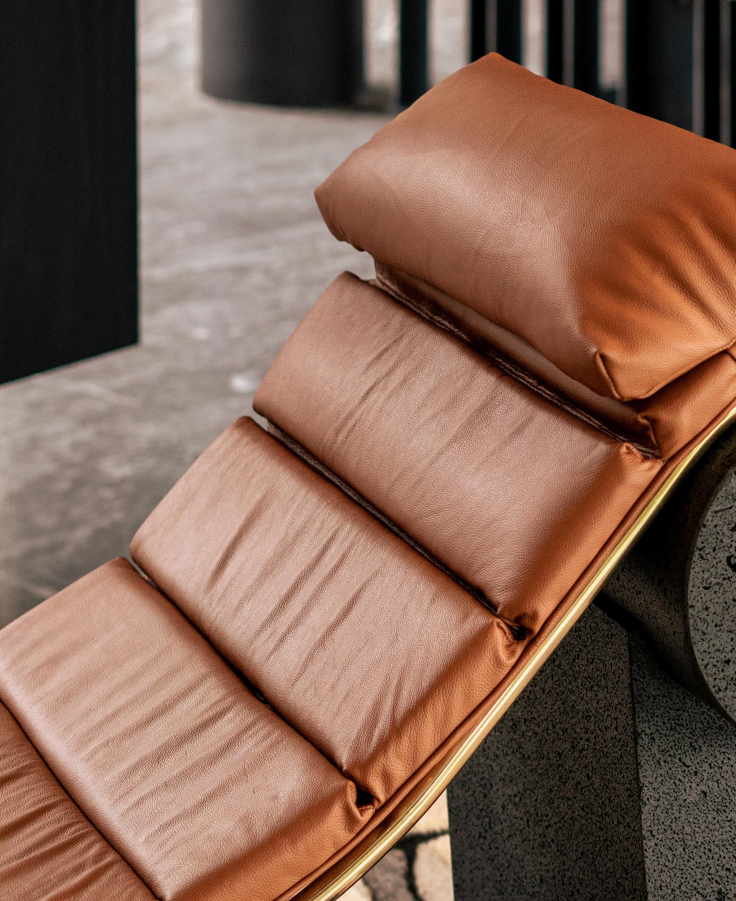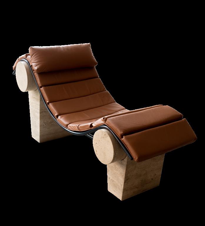 CHAISE LOUNGE SHOWN IN TRAVERTINE BASE AND LEATHER UPHOLSTERY.