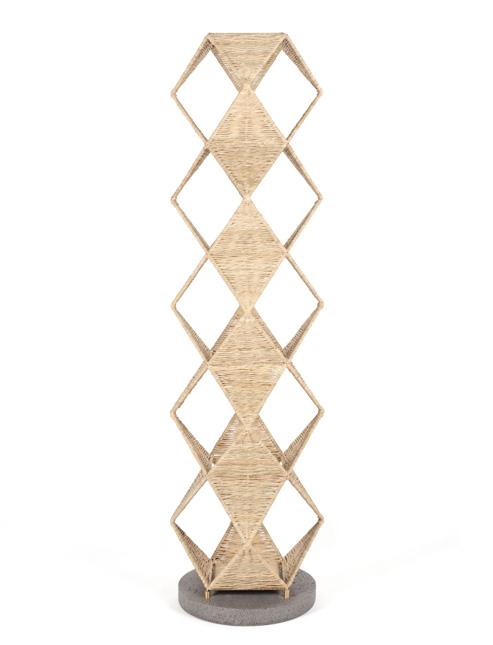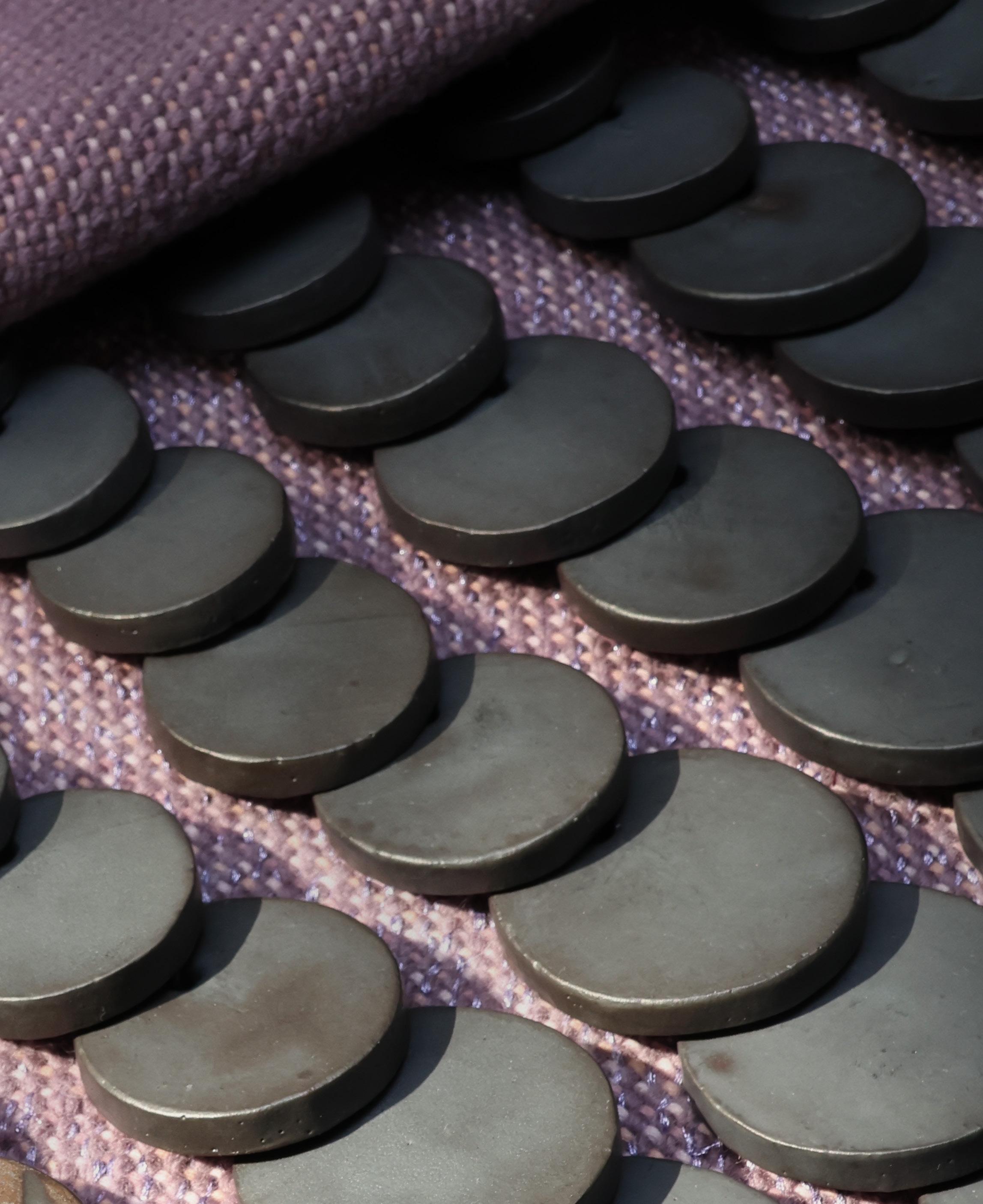 OPEN WEAVE OF NEW ZEALAND WOOL WITH CERAMIC BEADS IN MATTE BLACK ENAMEL FINISH, SUPPORTED BY A TEAK WOOD STRUCTURE WITH STEEL REINFORCEMENT.