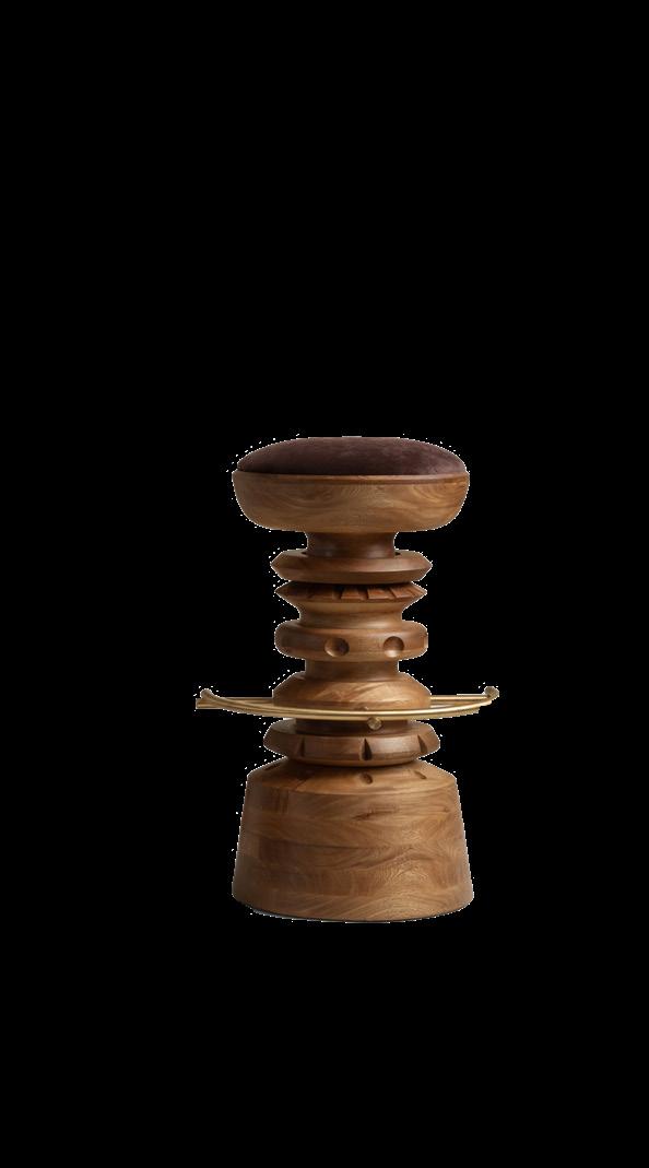 BARSTOOL IN ROSA MORADA WOOD, OILED FINISH, AND MOHAIR VELVET UPHOLSTERY.