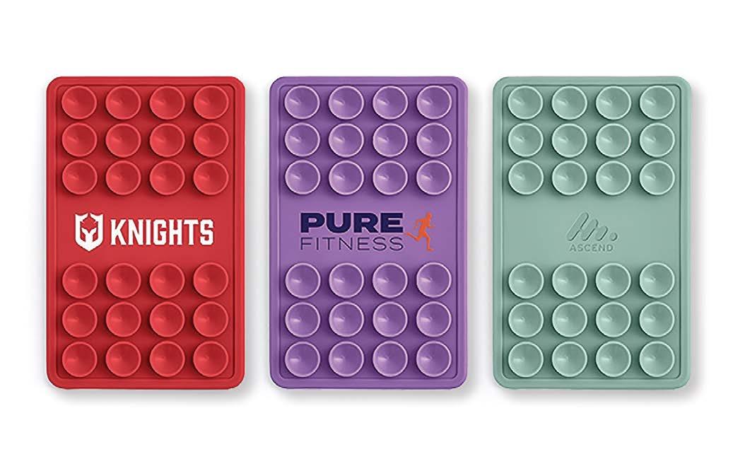 Pantone-matched silicone phone mount that securely attaches to smooth surfaces for hands-free, effortless use. Keeps your brand visible and on-trend wherever it goes.