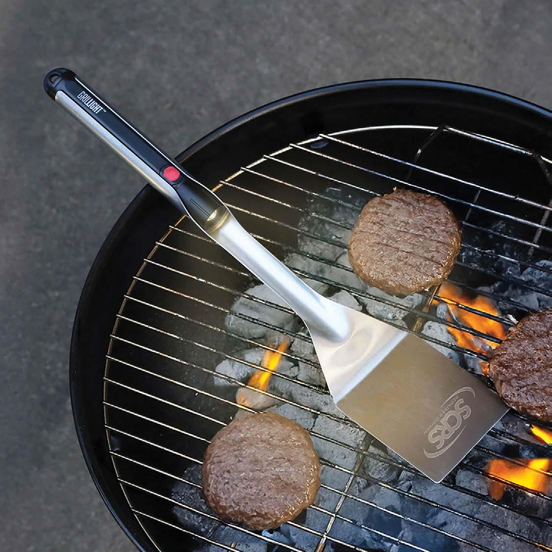 Grill day or night with this durable stainless steel BBQ spatula, featuring a built-in LED flashlight with an easy on/off button for perfectly lit precision cooking.